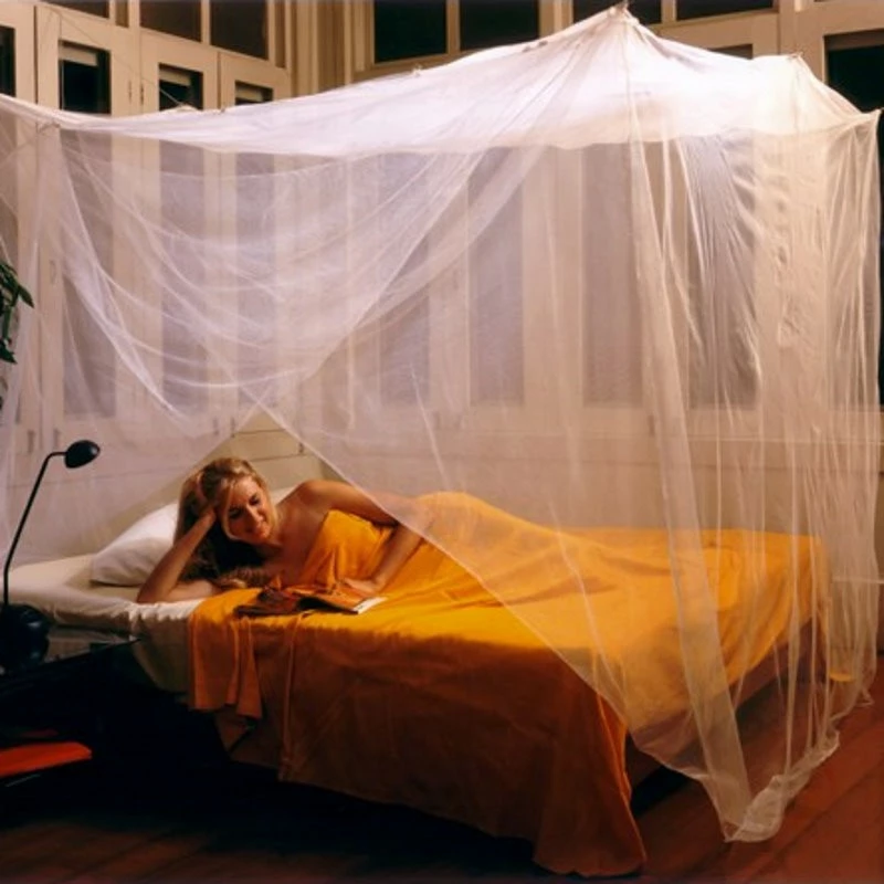 Trois grands avantages sont à souligner au sujet de la moustiquaire Pharmavoyage Bangla : la forme parfaitement rectangulaire, ses dimensions extrêmement généreuses et son imprégnation à la perméthrine. Le fait que cette moustiquaire soit rectangulaire et extrêmement spacieuse apporte un confort inégalé : vous dormez sans sensation d’étouffement et vous vous tenez largement debout ou assis puisque ses dimensions sont de 220 cm de longueur et 200 cm de largeur pour 200 cm de hauteur. On a un donc un espace largement suffisant pour 2 adultes et on peut y installer sans problème un lit de 160 cm de large par exemple. Parce que la Bangla est une moustiquaire imprégnée, vous êtes encore plus protégé qu’avec une moustiquaire classique : même si un insecte arrive à rentrer à l’intérieur (lorsque vous ouvrez la paroi par exemple), celui-ci est rapidement mis hors d’état de nuire grâce à l’imprégnation à la perméthrine. Résultat : les moustiques sont de l’histoire ancienne.