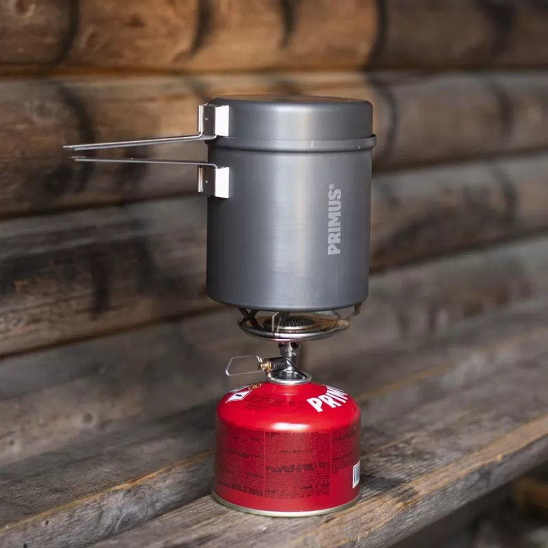 Les dimensions totales de la popote Trek Pot Primus en version 1 litre ont été étudiées pour un encombrement optimal et un rangement facile dans n’importe quel sac de trek ou n’importe quel sac de randonnée. Bien qu’elle ait une capacité d’1 litre, on peut la qualifier de popote compacte (volume de stockage : 145 x 117 mm). Et comme vu précédemment, on peut aussi la qualifier de popote légère grâce à son poids-plume (poids : 270 grammes). Elle ne peut pas s’ouvrir toute seule pendant le transport : la poignée de la casserole permet de bloquer la popote en position fermée. La popote Trek Pot ne s’arrête pas en si bon chemin : elle possède aussi un fond renforcé (fond plus épais) afin de réduire le risque de surcuisson de vos aliments (aliments brûlés) et d’améliorer la distribution de la chaleur. De plus, le fond a une structure en spirale pour un meilleur rendement thermique et une meilleure accroche sur le support de votre réchaud de bivouac (davantage de stabilité et davantage de sécurité). Conclusion : on tient là une excellente popote de trek et une excellente popote de randonnée. La Trek Pot porte bien son nom.